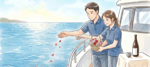プロによる委託海洋葬は、ご家族に代わって熟練のスタッフが、厳かな儀式とともにご遺骨を母なる海へとお還しします。